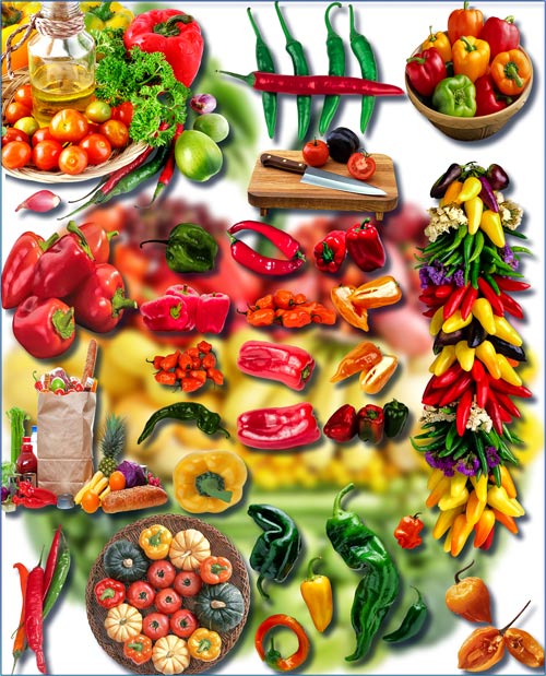 Перец острый - красный, желтый, зеленый шишатый, в нарезках, в композициях и отдельно 332 png | 2423x1683; 3118х2221 | 300 dpi | 1.69 Gb |